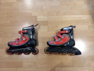 Se venden patines en línea en talla 40. Son cómodos y seguros para patinar. - Color rojo y negro. - Cierre con velcro y hebillas. - Ruedas ABEC-3. Prácticamente nuevo, se ve en el freno que no está nada desgastado.