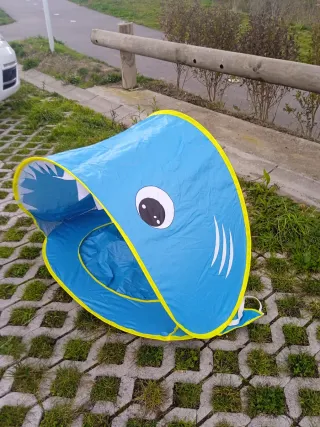 Divertida tienda de campaña con diseño de tiburón para los más pequeños. Ideal para jugar en casa o al aire libre. Sleeping Pad. Marca: LEVORYEOU. *CURIOSIDAD: Lo del centro circular es una pequeña piscina para poner encima de la arena.****** - Color azul con detalles amarillos. - Diseño de tiburón con ojo y dientes. - Material de tela resistente.