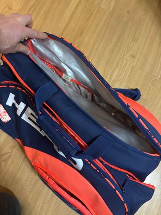 Mochila de pádel de la marca Head, modelo Fernando Belasteguín. - Color azul marino y naranja. - Logo de Head en blanco. - Firma de Fernando Belasteguín.