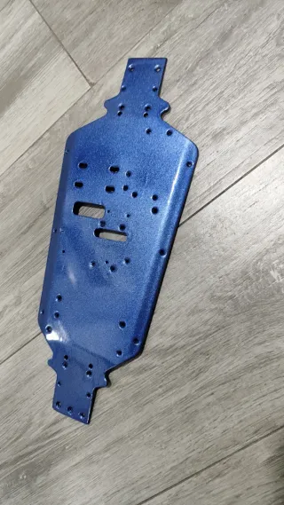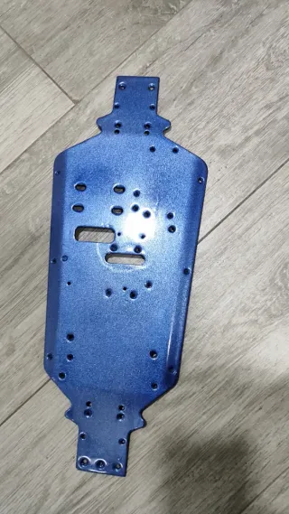 Chasis para coche radiocontrol a escala 1/8. Fabricado en metal con un acabado azul brillante. - Diseño específico para modelos 1/8. - Múltiples orificios para montaje de componentes. - Color azul metálico.