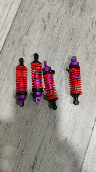 Set de cuatro amortiguadores de aceite para coche RC a escala 1/7 o 1/8, regulables. Son de un Bycmo de escala 1:7. Presentan un diseño llamativo en color morado y rojo. Son de aluminio. 80mm entre ojales. - Color: Morado y rojo. - Escala: 1/7. - Cantidad: 4 unidades.