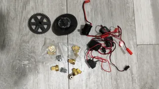 Lote de componentes para coche RC. - Dos engranajes grandes de plástico negro. - Varios engranajes pequeños de metal dorado y plateado. - Varios cables y conectores.