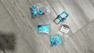Conjunto de soportes para engranajes de coche RC en color azul. Son nuevos. Les falta el eje pasante. Precio por los 4. - Fabricados en aluminio. - Incluye tornillería y rodamientos.
