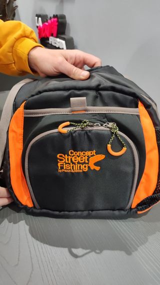 Mochila de pesca tipo chestpack, ideal para llevar tus accesorios de pesca. - Color negro y naranja. - Diseño con varios compartimentos y bolsillos. - Cremalleras con tiradores personalizados. - Tejido resistente y duradero.