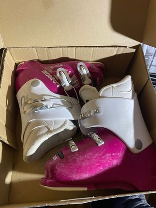 Bota de esquí para niño, con un diseño blanco y detalles en rosa. - Talla 16.5 - Cierre con hebilla. - Interior forrado en gris.