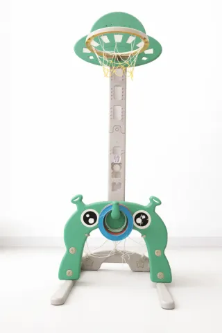 Canasta de baloncesto y juego de aros para niños. Con portería para jugar a fútbol. - Diseño divertido con temática de extraterrestre. - Incluye canasta de baloncesto y aros para lanzar. - Estructura de plástico resistente en color verde y gris. - Base estable para mayor seguridad. La red de la portería está rota