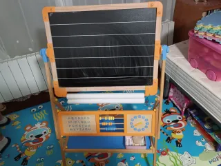 Pizarra de madera para que los niños aprendan y se diviertan. - Pizarra negra para tiza. - Pizarra blanca para rotulador. - Incluye rollo de papel. - Incluye ábaco y reloj. - Incluye abecedario.
