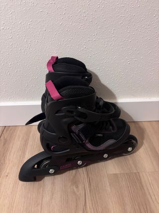 Patines en línea de la marca Oxelo en color negro con detalles en rosa. Perfectos para iniciarse en el patinaje. - Cierre con velcro y hebilla. - Ruedas de 76mm. - Bota cómoda y ajustable. - Número 36 - Puesto no mas de 5 veces - Patines+bolsa+rodilleras