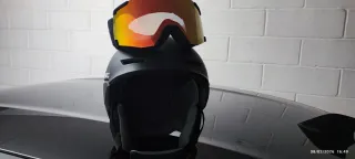 Conjunto de casco de esquí Atomic y gafas Salomon. - Casco de color negro mate. - Gafas con lente naranja reflectante y cinta negra con logo Salomon. Trato en mano.