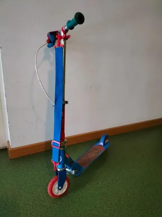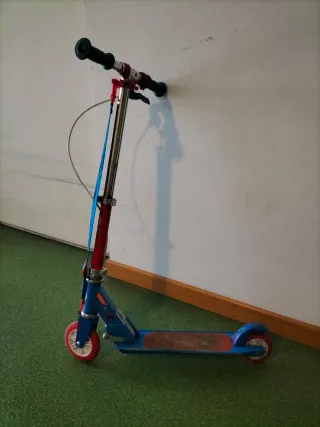 Patinete de color azul y rojo, de dos ruedas, con cinta para llevar colgado cuando se pliega. Diseñado para niños de 3 a 6 años. Con freno de mano y también de pie. Ideal para iniciarse en el mundo del patinete. - Estructura de metal. - Ruedas de goma. - Manillar ajustable.