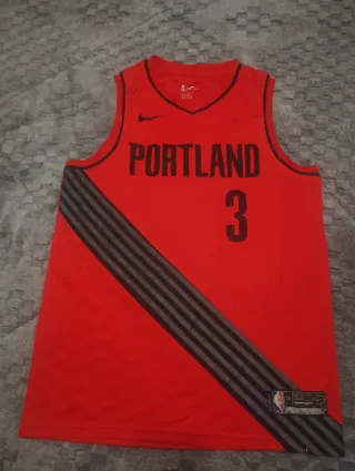 Camiseta de baloncesto Nike NBA del equipo Portland Trail Blazers, número 3. Tiene dos puntitos negros en la parte inferior de atrás (se ven en las fotos) - Color rojo con detalles en negro y gris. - Diseño con franjas diagonales. - Logo oficial de Nike y NBA.