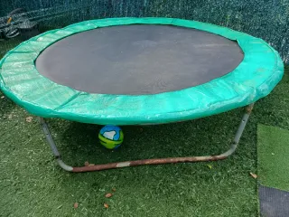 Cama elástica para exteriores con funda protectora nueva. - Diámetro aproximado: 240cm - Estructura metálica resistente Altura 60cm, algo de roña parte abajo de estar calle, pero perfecto estado de lona saltar y funda nueva. Se desmonta para transporte