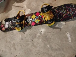 Tabla de snowboard con fijaciones incluidas. Diseño llamativo con gráficos geométricos y detalles en amarillo. 130 cm - Fijaciones ajustables. - Diseño multicolor.