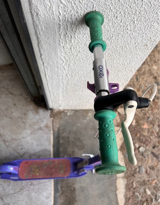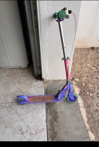Patinete infantil plegable, perfecto para los más pequeños. Su diseño es llamativo y es fácil de guardar. - Color principal morado con detalles en rosa. - Ruedas de color verde. - Plataforma con superficie antideslizante. - Plegable - Con freno