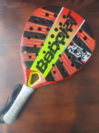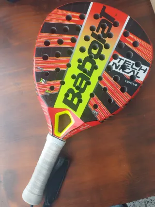 Pala de pádel Babolat Technical Vertuo con un diseño llamativo. - Pala de pádel. - Modelo: Technical Vertuo. - Marca: Babolat. - Diseño con detalles en rojo y negro. - Empuñadura blanca.