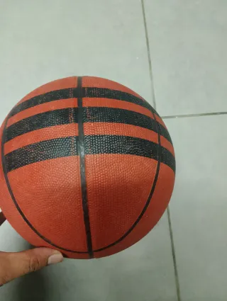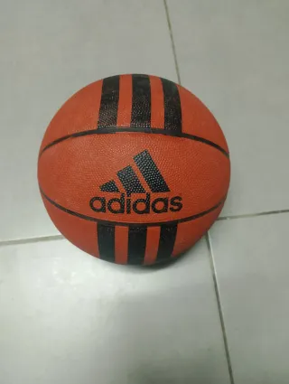Balón de baloncesto de la marca Adidas con un diseño clásico en naranja y negro. - Diseño con tres rayas negras. - Logo de Adidas visible.