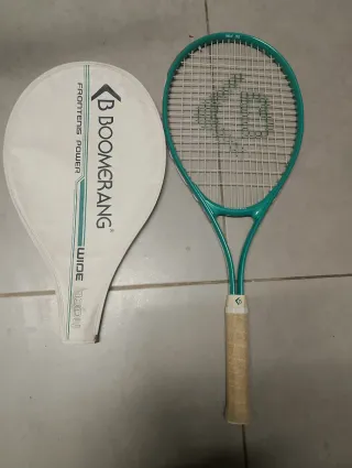 Raqueta de tenis Boomerang Wide Body con funda. - Raqueta de tenis color verde. - Funda protectora blanca con detalles en verde. - Marca: Boomerang. - Modelo: Wide Body.