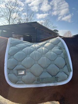 Mantilla de equitación de la marca Equestrian Stockholm. Diseño acolchado con un patrón de rombos y detalles de la marca. viene con vendas de la marca anky - Color verde grisáceo. - Ribete blanco. - Cinchas de sujeción.