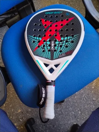Pala de pádel Drop Shot Okaido con un diseño moderno y llamativo. - Superficie con acabado de carbono. - Detalles en color rojo y turquesa. - Incluye correa de seguridad en el puño. -Se vende porque me han regalado una y ya no voy a usar está.