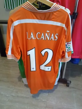 Camiseta de fútbol del Betis. - Color naranja con detalles blancos. - Número 12 y nombre J.A. Cañas en la espalda. - Logo LFP visible.