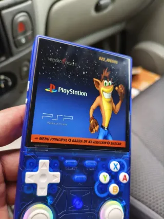 Consola portátil R36ultra. - Diseño transparente azul. - Pantalla brillante. - Botones de control.