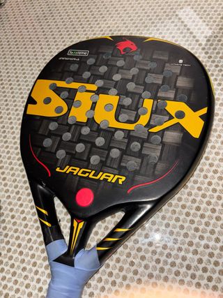 Pala de pádel Siux Jaguar con diseño deportivo. Solo usada un par de partidos. Lo único que tiene son tres rayitas blancas como se ve en la foto. - Pala de pádel. - Modelo Jaguar. - Marca Siux. - Diseño en negro, amarillo y detalles rojos. - Superficie con textura. - Mango con cinta protectora.