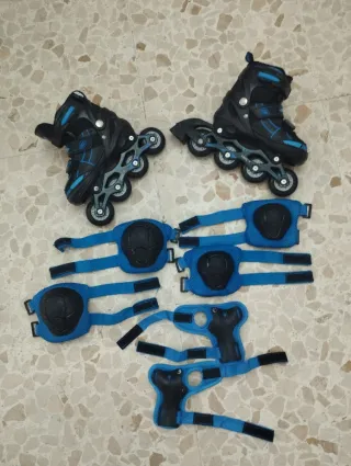 Set de patines en línea ajustables para niños, ideal para iniciarse en el patinaje. Incluye protecciones. - Patines ajustables en talla. - Incluye casco, rodilleras, coderas y muñequeras. - Color azul y negro. Talla 30-33,vienen grandes.