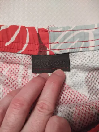 Bañador con estampado de flores tropicales en tonos rojos, marrones y azul claro. - Cintura con cordón ajustable. - Estampado floral. - Tejido ligero.