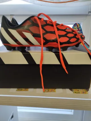 Zapatillas de fútbol para niño, talla 36. Diseño llamativo en naranja y negro con las icónicas tres franjas blancas de Adidas. - Cierre con cordones naranjas. - Suela con tacos para césped. - Marca: Adidas.