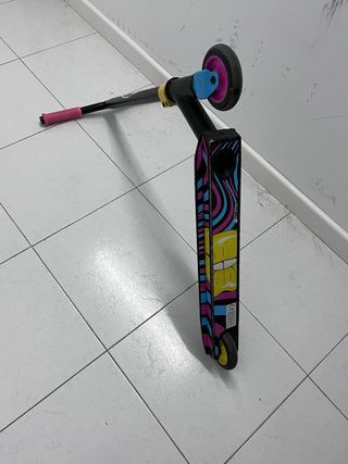 Patinete de estilo freestyle con un diseño llamativo. - Puños de color rosa. - Ruedas delanteras con detalles en azul y rosa. - Rueda trasera con detalles en azul y amarillo. - Plataforma negra. -Regalo casco de la foto
