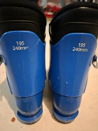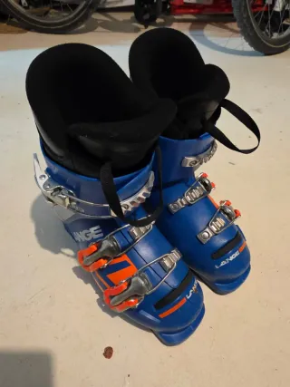 Bota de esquí para niño de la marca Lange. - Color azul con detalles naranjas. - Cierres de hebilla metálica. - Interior negro. - Usadas 8 o 9 días