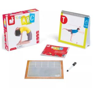 Juego educativo para aprender yoga con las letras del abecedario. - Incluye caja original. - Tarjetas con posturas de yoga. - Pizarra y rotulador.