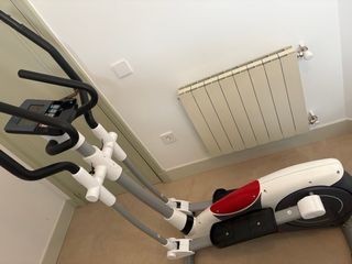 Bicicleta elíptica de la marca BH, modelo Athlon. - Diseño moderno en blanco, rojo y negro. - Estructura robusta y estable. - Pedales amplios para mayor comodidad.
