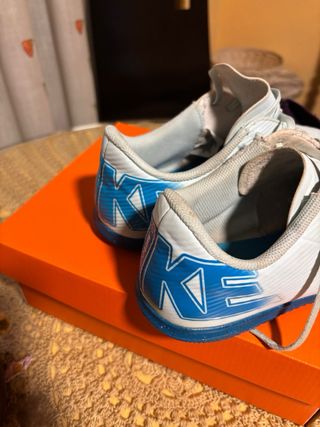 Zapatillas de fútbol sala Nike en color blanco con detalles en azul. - Talla 6Y (equivalente a 37 EUR / 24 cm). - Diseño deportivo con el logo de Nike. - Cierre con cordones.