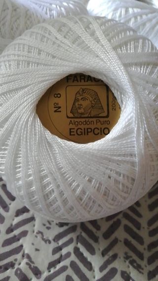 Se venden 6 ovillos de hilo de algodón egipcio. - Precio por unidad. - Marca: Faraón - Número: 8 - Color: Blanco - Material: Algodón Puro Egipcio - Peso: 200 gramos por ovillo