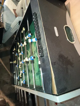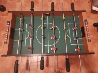 Futbolín de estilo clásico con campo de juego verde. - Barras metálicas con jugadores. - Marcadores en la parte superior.
