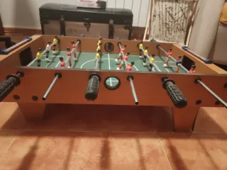 Futbolín de mesa compacto, perfecto para partidas rápidas y diversión en casa. - Campo de juego verde con líneas blancas. - Varillas metálicas con jugadores de plástico. - Marcadores de puntos en los laterales.