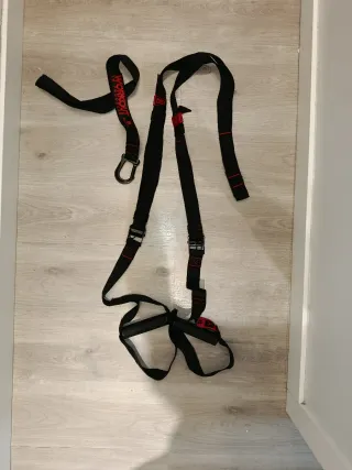 Sistema de entrenamiento en suspensión TRX. - Correas de nylon negras con detalles rojos. - Mosquetón metálico para anclaje. - Asas ergonómicas para manos y pies. - Incluye sus embalajes originales. - En perfecto estado (se ha utilizado 1 vez). - PRECIO NEGOCIABLE.
