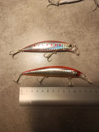 Set de dos señuelos de pesca diseñados para spinning. Acabado plateado con detalles rojos y un diseño alargado. He usado uno, el otro está nuevo. (El de cabeza negra nuevo) Triples durísimos. Al rededor de 30g