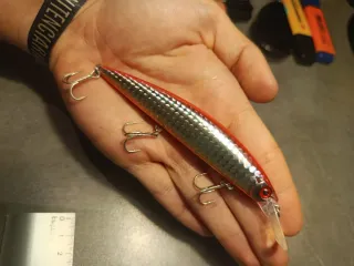 Señuelo de pesca diseñado para la lubina. Su forma alargada y acabado brillante lo hacen muy atractivo. - Tres anzuelos triples con anillas un poco manchadas de oxido (superficial). - Ojo rojo en la cabeza.