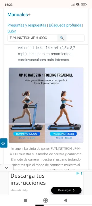 Cinta de correr FLYLINKTECH JF-H-40DC con modos de carrera y caminata. - Velocidad ajustable de 4 a 14 km/h (modo carrera). - Velocidad ajustable de 1 a 4 km/h (modo caminata). - Ideal para entrenamientos cardiovasculares.