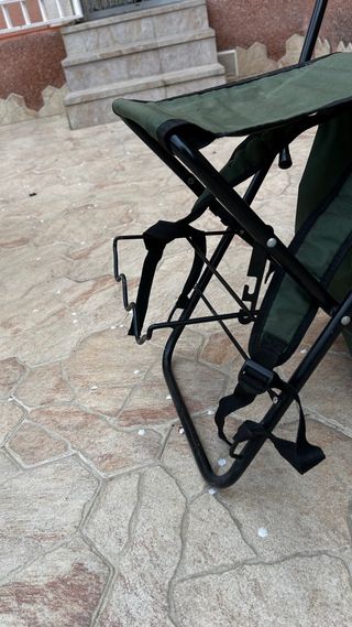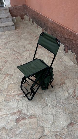 Silla plegable de color verde. Su diseño permite un fácil transporte y almacenamiento. Tiene dos bolsillos en la parte de atrás, y al cerrarla se transporta como una mochila. Tiene tambien reposacañas