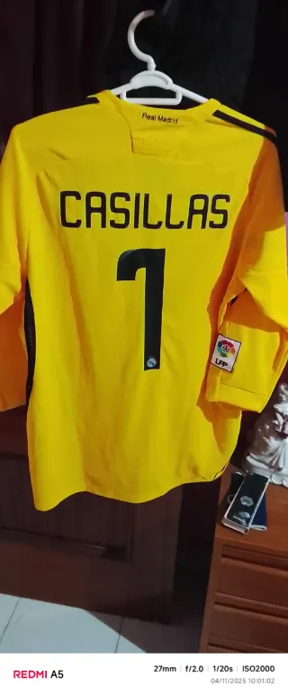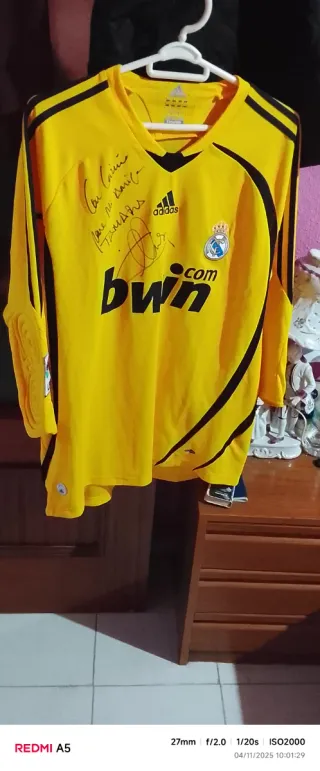 Camiseta de fútbol del Real Madrid de color amarillo, con manga larga y firmada. Iker Casillas - Diseño con detalles en negro. - Logo de Adidas. - Patrocinador Bwin.