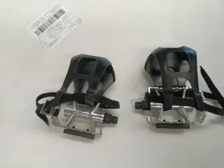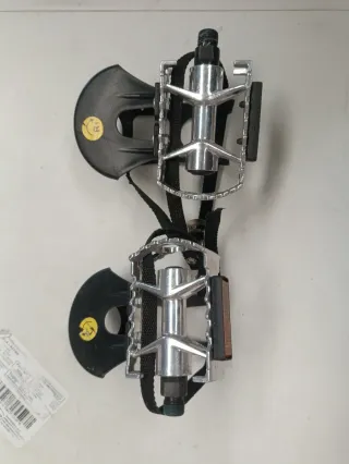 Pedales de repuesto para bicicleta estática, listos para instalar. - Color negro y plateado. - Incluyen cintas de sujeción.