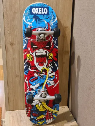 Monopatín de la marca OXELO con un llamativo diseño. Tiene la parte de arriva algo despegada y una grieta en una punta. Ver fotografías. - Diseño gráfico de mono samurái en la base. - Ruedas negras. - Ejes metálicos.