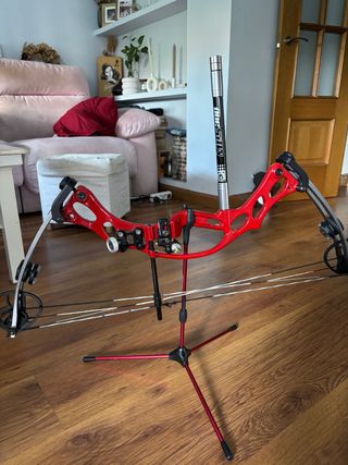 Arco de poleas de color rojo, ideal para la práctica de tiro con arco. - Diseño moderno y robusto. - Incluye soporte para arco, flechas, estabilizador, saca flechas, protector y mochila