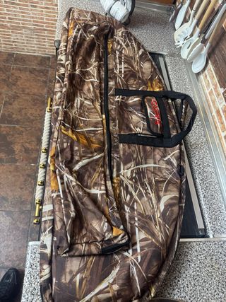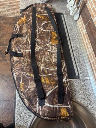 Funda de transporte para arco de poleas. Presenta un diseño de camuflaje. - Cierre de cremallera. - Asa de transporte. - Bolsillo frontal con cremallera, para transporte flechas.