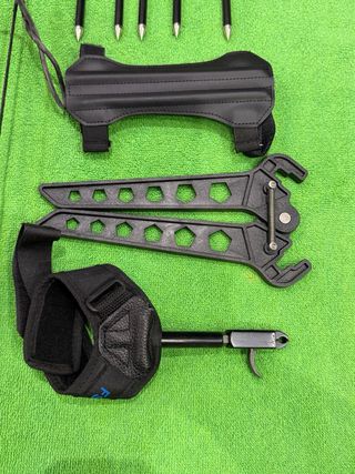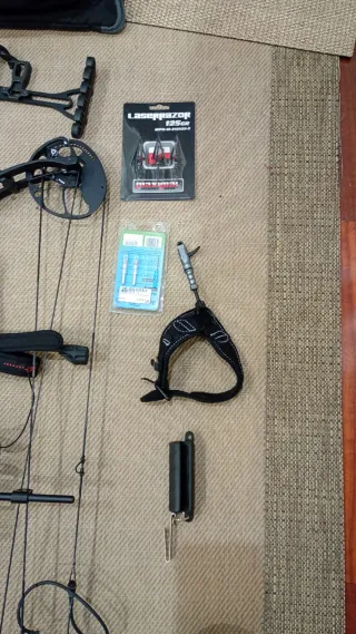 Conjunto de accesorios para arco de poleas. - Protector de brazo. - Dactilera. - Rest de flecha. - Mirilla. - Soporte para mirilla. Se a usado cuatro veces para tirar a una diana