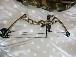 Arco de poleas con un diseño de camuflaje. Hasta 70 LBS. - Cuerpo principal con acabado de camuflaje. - Sistema de poleas y cuerdas. - Empuñadura ergonómica. 621 30 14 34 Fran Mejor llamar o watshap