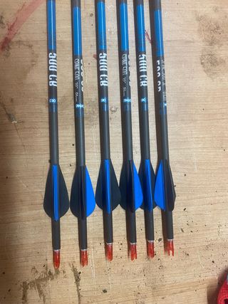 Se venden 6 flechas para tiro con arco, modelo 300 CB. - Longitud de 32 pulgadas. - Diseño con plumas azules y negras. - Incluyen culatines naranjas. - Para arco poleas en muy buen estado.